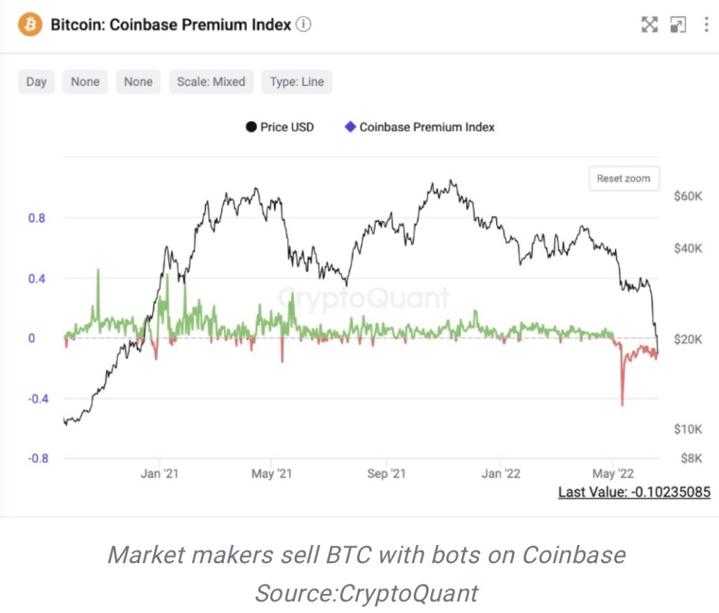 According to data from CryptoQuant, market makers (MMs) have been running trading bots to sell Bitcoin (BTC) on Coinbase for the last 45 days. The continued selling of BTC has seen its price drop even lower in the last 24 hours according to crypto market tracker CoinMarketCap.